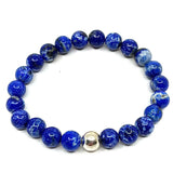 This lapis lazuli bead bracelet has one hematite accent bead. Beads are 8 mm.