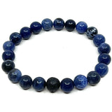 This blue sodalite bracelet has one black lava accent bead. Beads are 8 mm.