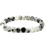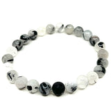 This tourmalinated quartz bracelet has one black lava accent bead. Beads are 8 mm.