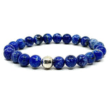 This lapis lazuli bead bracelet has one hematite accent bead. Beads are 8 mm.
